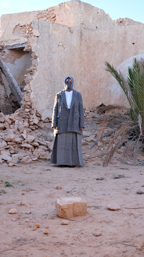 A pleated maxi skirt in classic style. It features two outside pockets in the side seams, and a hidden inside pocket in the back belt. With four belt loops, it can be styled in many ways. It is woven from a blend of cream and grey lamb's wool to produce a lovely subtly-textured grey.